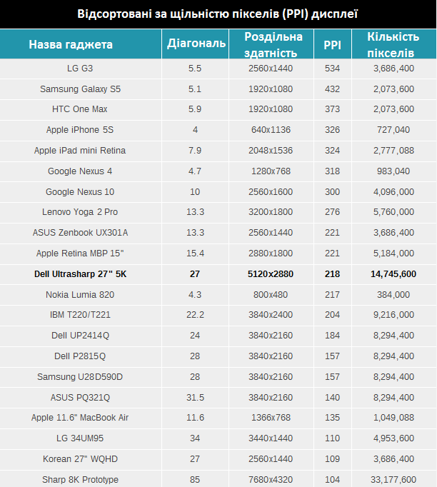 Монітор Dell Ultrasharp 27 ще називають дисплеєм з роздільною здатністю 5K, оскільки в ньому саме 5 тисяч точок по горизонталі. Зважаючи на його діагональ у 27 дюймів, щільність точок на квадратний дюйм складає 218 ppi. Це означає, що розмір пікселя майже такий самий, як і в 15-дюймового ноутбука Apple MacBook Pro з дисплеєм Retina. Останній має роздільну здатність 2880×1800 пікселів, проте меншу діагональ – усього 15 дюймів, завдяки чому в нього 221 ppi.