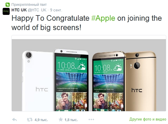 А британьске відділення HTC скромно привітало Apple зі вступом до виробників гаджетів з великими екранами: