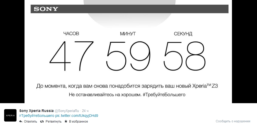Тонко відреагувала і Sony Mobile, розмістивши у своєму Twitter зворотний відлік часу, але тільки не до анонсу своєї чергової новинки, а до повної розрядки акумулятора в Xperia Z3 (показавши свою перевагу за цим параметром):