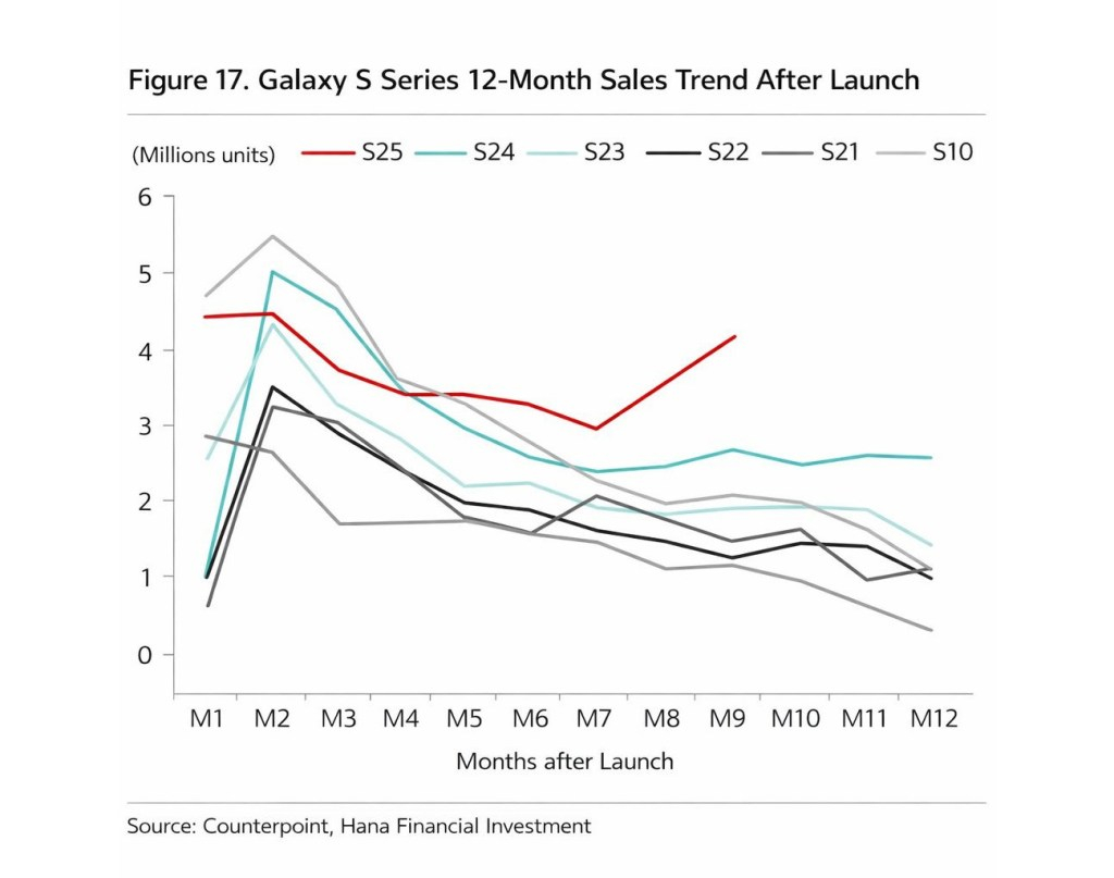 Однако в случае с серией Galaxy S25 ситуация иная. Данные, полученные Counterpoint Research и Hana Financial Investment и которыми поделился инсайдер @UniverseIce, позволяют предположить, что примерно через девять месяцев после запуска сериала, в ноябре 2025 года, уровень его популярности приблизился к показателям первого месяца продаж. Хотя ни один из этих источников не обнародовал подробные цифры, имеющаяся информация предполагает, что Samsung удалось оправдать ожидания потребителей с серией Galaxy S25, и что маркетинговая и коммерческая стратегии компании оказались эффективными.