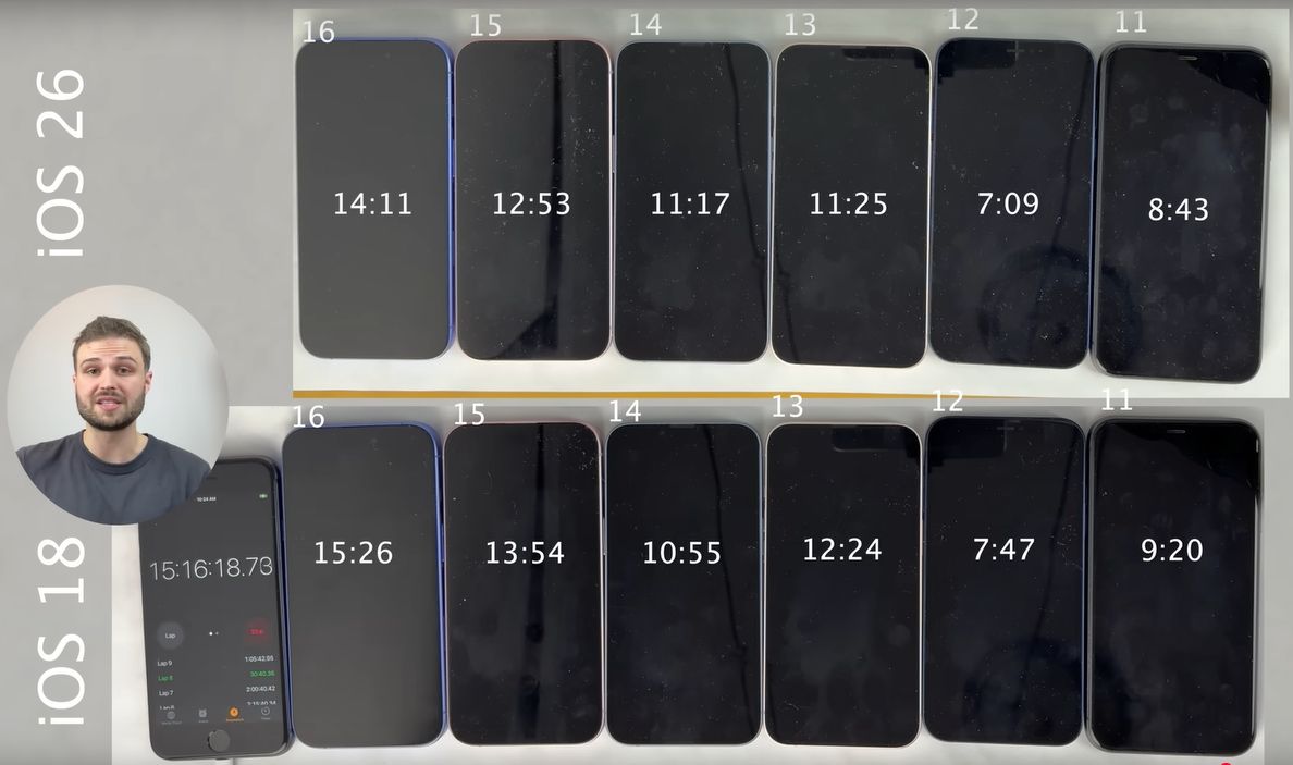 Энтузиаст взял iPhone 16, 15, 14, 13, 12, 11 и проверил их автономность сначала на iOS 18, а затем обновил их на iOS 26 и провел тот же тест автономности. Для обеих версий системы использовались одни и те же устройства с одинаковыми батареями. Это важно, поскольку, каждый iPhone имеет разный уровень износа батареи.