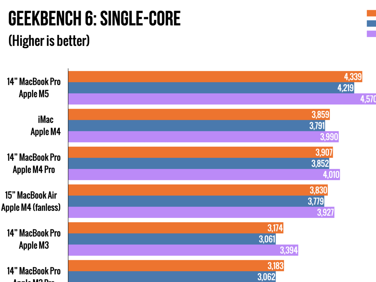 В сумме это означает, что M5 более чем в два раза быстрее M1 и почти приближается к уровню производительности некоторых процессоров Pro и Max предыдущих поколений. В многопоточных тестах он превосходит M1 Max, а в однопоточных быстрее более чем на 80%. Хотя графическая производительность не дотягивает до старших Max или Ultra, для большинства CPU-ориентированных задач этого более чем достаточно.