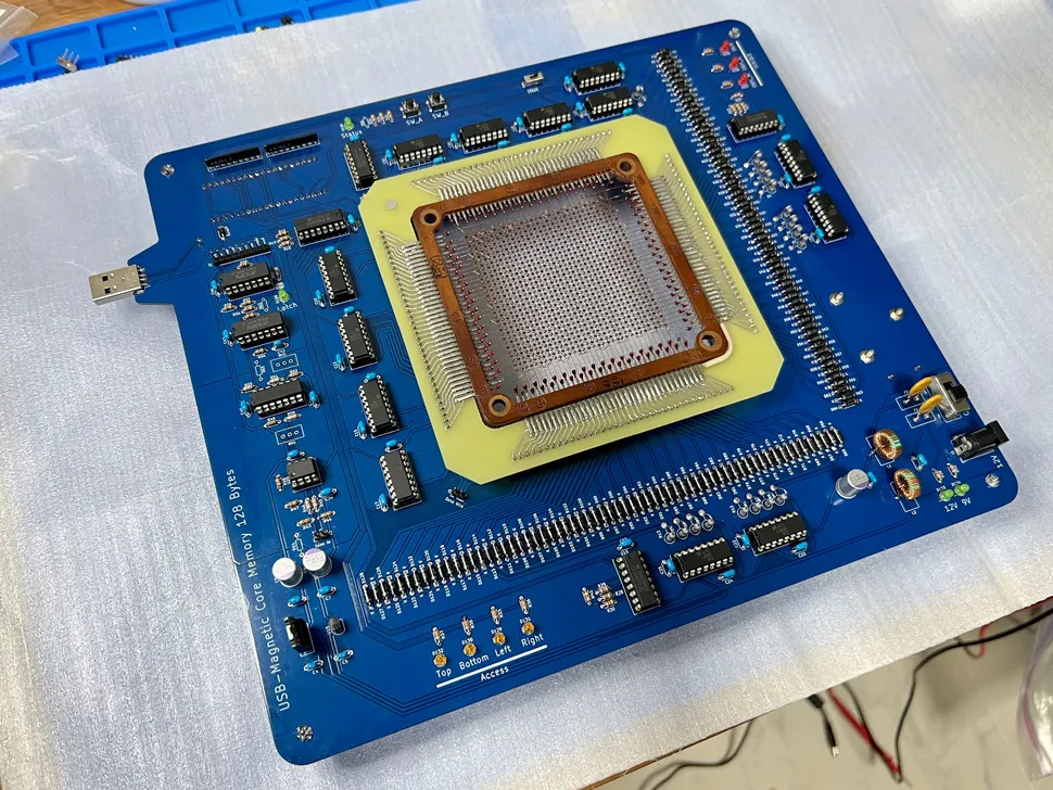 Японский технический энтузиаст объединил эту чрезвычайно старую технологию хранения данных с современными интегральными микросхемами и интерфейсами, в результате чего появился этот нетипичный USB-флеш-накопитель. Вокруг центрального энергонезависимого сердечника размещены современные компоненты, в частности драйверные микросхемы, усилители считывания, светодиоды, а реализацию USB-интерфейса обеспечивает микроконтроллер Raspberry Pi Pico. Именно он также отвечает за цикл повторной записи данных после считывания.