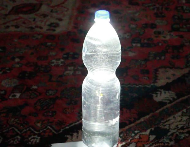 Для перетворення мобільного на лампу знадобиться пластикова пляшка та програма-ліхтарик, яку можна безплатно завантажити з магазину програм. Пляшка має бути прозорою, і її необхідно наповнити такою ж водою. Після цього достатньо увімкнути програму-ліхтарик на смартфоні та поставити на його світлодіод ємність по центру. Будьте обережними, щоб вода не потрапила на мобільник.