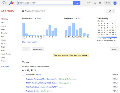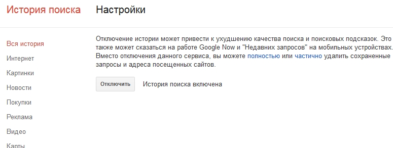 Кожний запит у пошуковому рядку Google записується в його базах данних для того, щоб оптимізувати результати видачі та показувати рекламу відповідного профіля. Можна позбавити пошуковик подібної можливості стеження, якщо видалити всі записи з пошукової історії.
