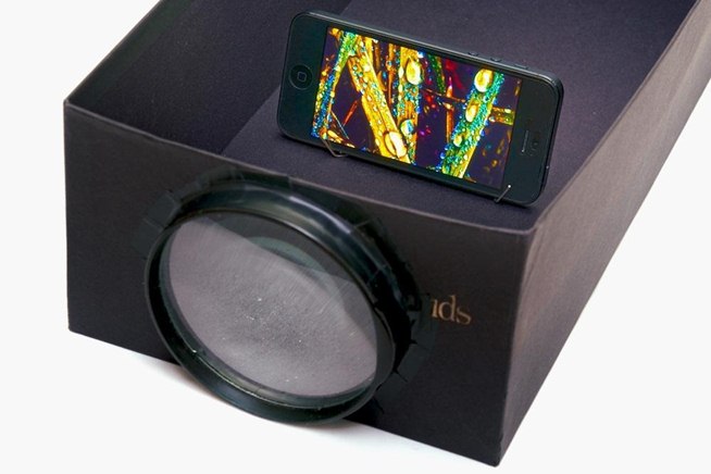 Після цього закріпіть за допомогою липкої стрічки лінзу так, щоб повз неї не проходило світло. Розмістіть коробку на столі та помістіть у неї телефон. Включіть на ньому якесь відео та рухайте його для налаштування оптимального фокусу. Зафіксуйте смартфон у коробці за допомогою декількох скріпок та липкої стрічки.