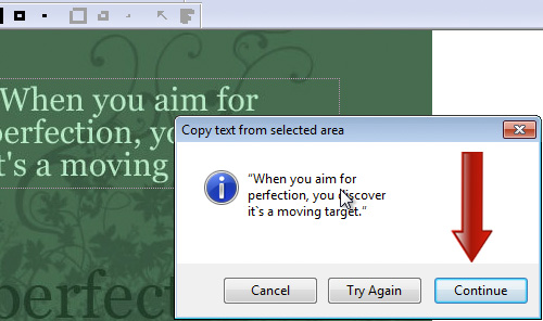 Якщо відпустити кнопку миші, тоді система одразу розпізнає текст та виведе його у вікні. Щоб скопіювати його в буфер обміну, потрібно натиснути клавішу Continue.