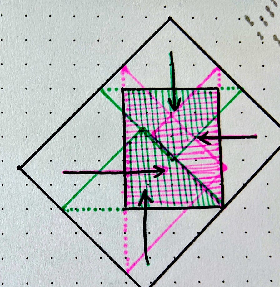 Діагональна орієнтація працює тому, що загортання проходить по довгих сторонах прямокутних трикутників, тобто по їх гіпотенузах, які здатні повністю перекрити край предмета. Якщо виступи з обох сторін загортаються і хоч трохи перекриваються, весь предмет покрито повністю. Ефективна довжина загортання збільшується з 7 або 9 дюймів до понад 11 дюймів (понад 27.94 сантиметра) по діагоналі. Приклад з паперовою «ворожкою» показує, як точно можуть збігатися краї, якщо аркуш квадратний.