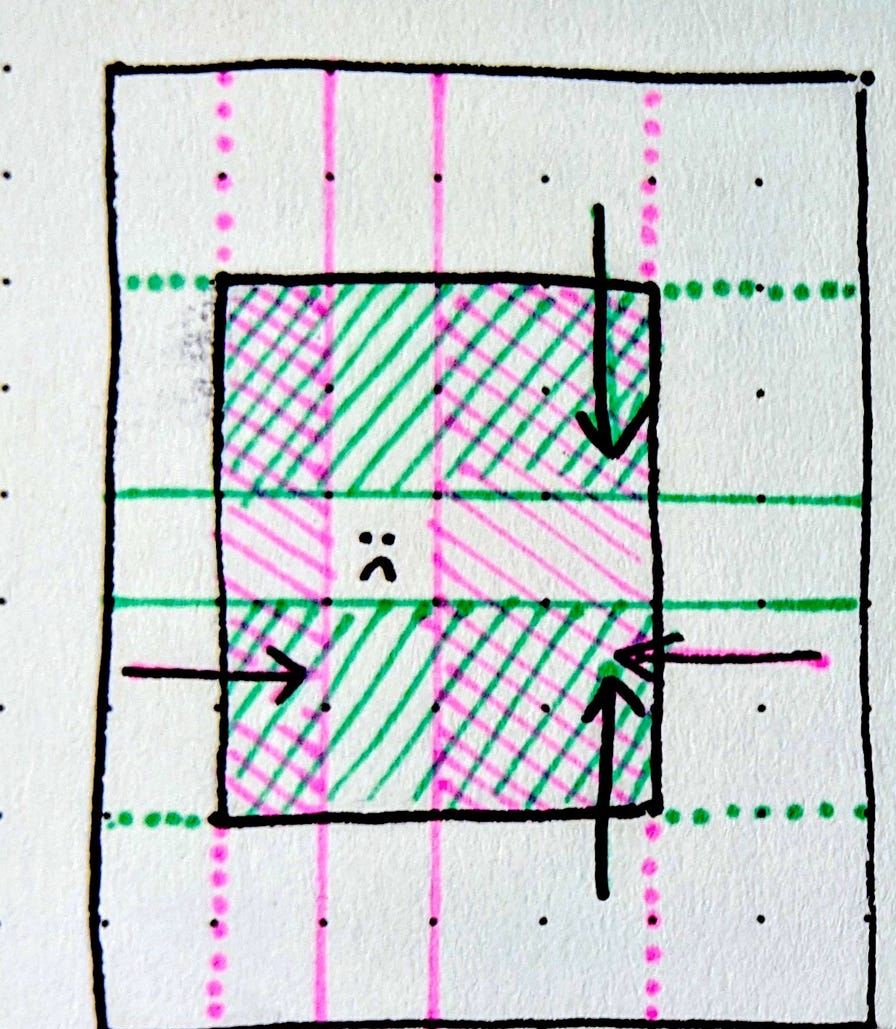 Було використано аркуш площею 63 квадратні дюйми для загортання предмета площею 20 квадратних дюймів. У разі теоретично ідеальної ефективності мінімально необхідна площа складала б 40 квадратних дюймів. Аркуш містить 23 зайві квадратні одиниці. Вони формують запас, потрібний для того, щоб папір міг повністю обгорнути предмет по периметру. Для книжки 4 × 5 дюймів це означає мінімум 8 дюймів (20.32 сантиметра) в одному напрямку або 10 дюймів (25.40 сантиметра) в іншому. Аркуш 8 × 8 чи 10 × 6 дюймів був би достатнім.