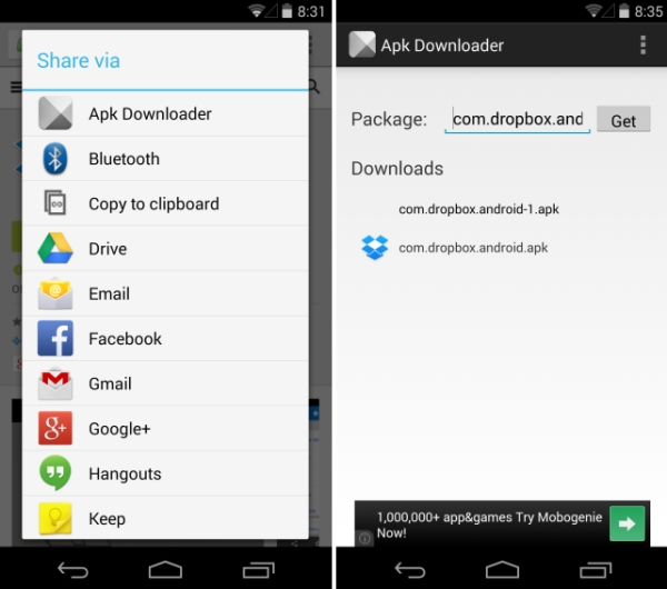 Для збереження інсталяційних файлів програм Android потрібно скористатись розробкою Apk Downloader Extension. Робота з нею дуже проста: необхідно вставити посилання на програму в адресний рядок браузера та зберегти APK в пам’яті мобільного гаджета. Для цього у веб-навігаторі треба натиснути клавішу «Поділитись» та натиснути там кнопку APK Downloader.