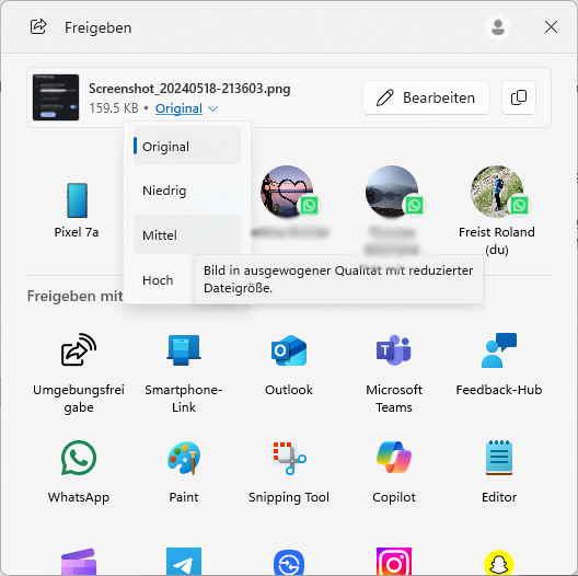 Після цього відкривається окреме вікно спільного доступу, у якому під назвою файлу відображається невелике меню з параметром «Оригінал», встановленим за замовчуванням. Натискання на стрілку поруч відкриває список рівнів стиснення, серед яких доступні варіанти «Низький», «Середній» та «Високий». У разі вибору одного з цих рівнів Провідник Windows одразу показує оновлений, зменшений розмір файлу, з яким зображення буде передано до обраного застосунку або сервісу.