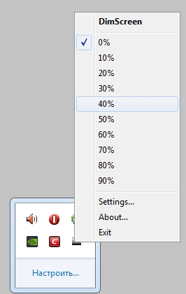 Окрім вибору рівня затемнення через іконку в системному треї, у DimScreen також можна встановити початковий рівень яскравості при запуску та гарячі клавіші для швидкого перемикання між ними.