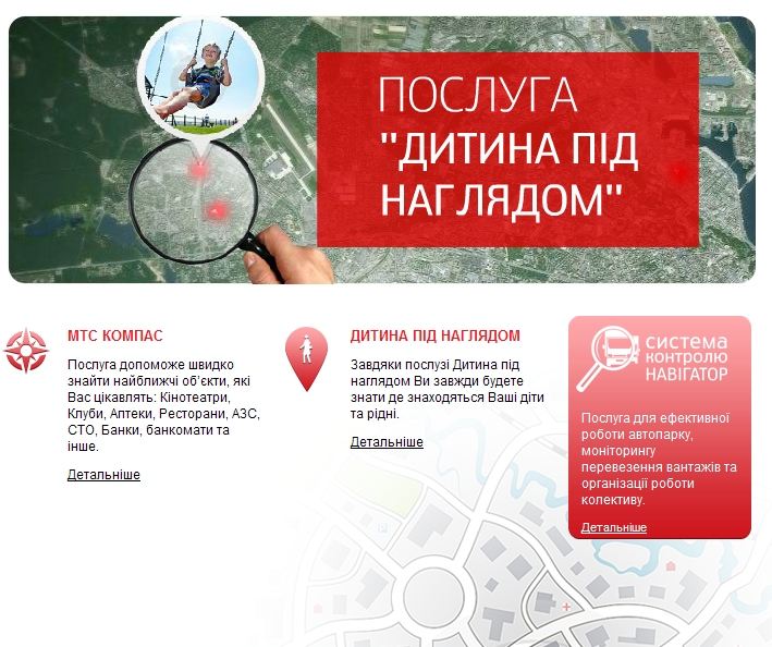 Екстремальна ситуація, в яку може потрапити будь-який з нас, – заблукати в незнайомій місцевості. У цьому випадку на допомогу прийде послуга «МТС Компас» – за допомогою SMS-запитів можна не тільки визначити своє місце розташування, але й отримати інформацію про місцезнаходження найближчих аптек, АЗС, готелів або вокзалів. Для того щоб скористатися послугою, необхідна наявність працюючого GPRS у телефоні.